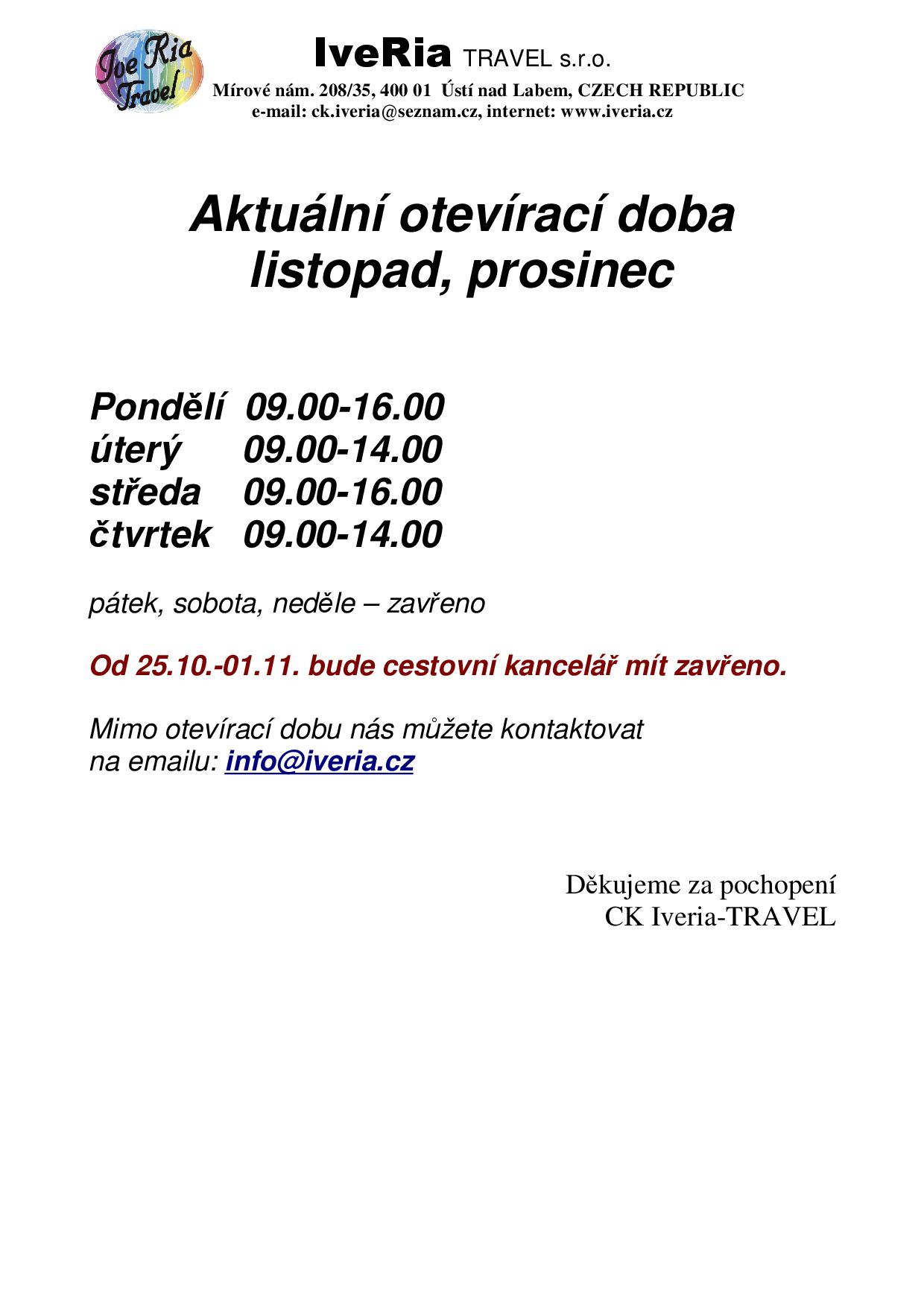 Otevírací doba cestovní kanceláře listopad, prosinec